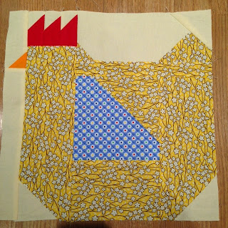 I am using my small stash of 30's prints for my chickens. The background is a pale yellow Kona cotton. I made all of the beak strips and the red parts for the heads of the chickens last week so that makes it easier to make the rest of the block when I have a bit of sewing time.