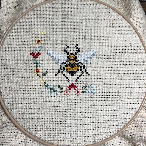 I finished the cross stitching on the bee this week and moved on to the wreath of flowers and hearts around the bee. There is still some backstitching to do as well, but I will do that once I am done with the cross stitching. I have not done any counted cross stitch in a while and I am enjoying this little project.