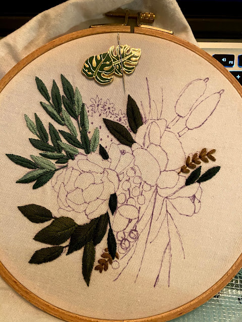 More stitches were added to Love Birds again this week--I finished the leaves in this section and have the cream coloured flower about 3/4 done.